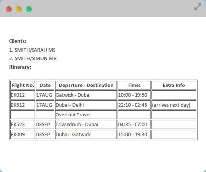 Simply takes the raw, hard to read, PNR flights output of Amadeus, Galileo, Sabre or Fare Wizard booking and reservation systems and turns it into a customer friendly table.